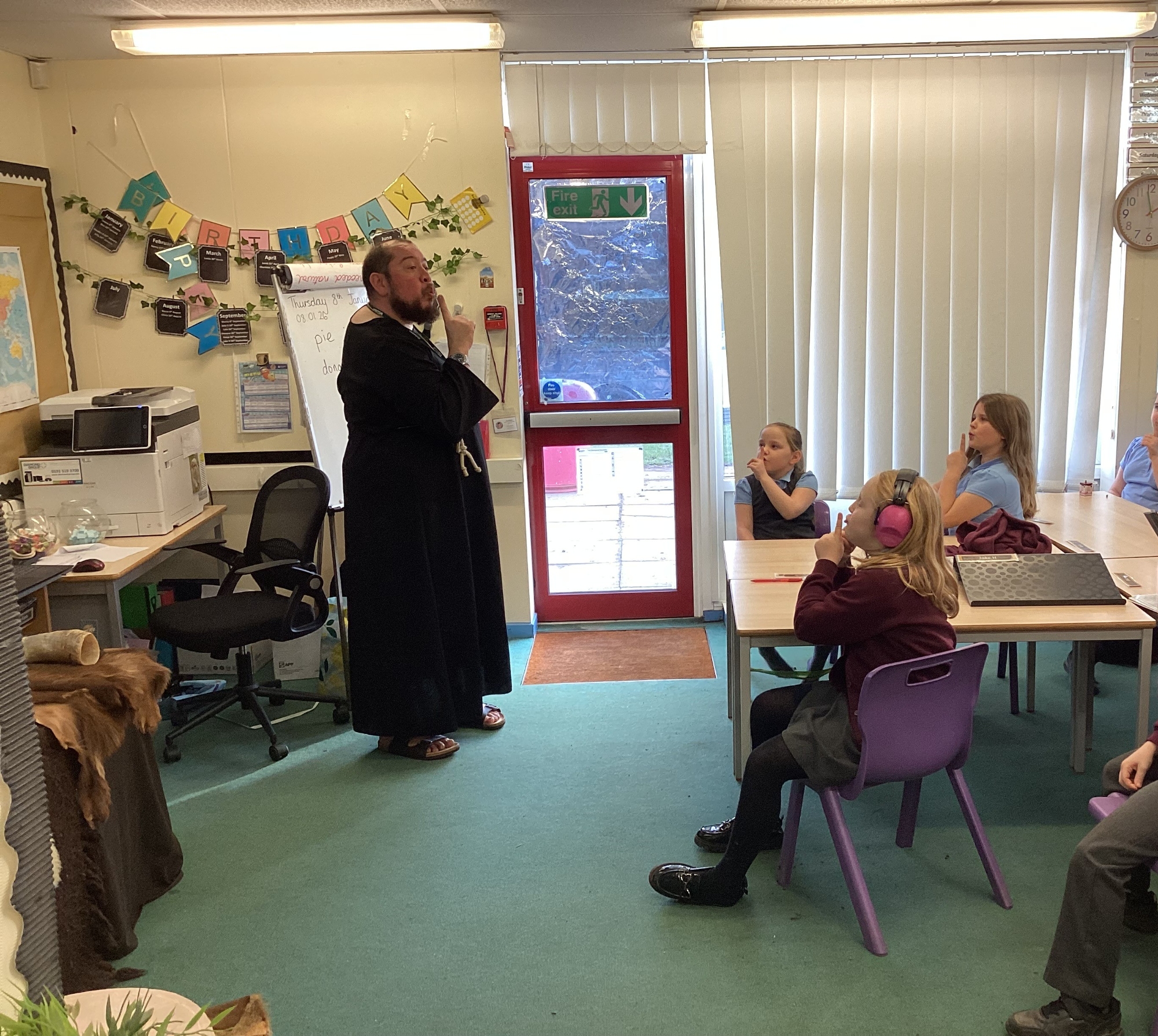 -Saxon monastery. We learnt how monks communicate when observing the strict rules of silence using the ancient hand gestures and had a go. We found out what jobs monks did for their community and had hands-on with some replica Anglo-Saxon objects. We learnt how to create beautiful handwriting using real quill pens and ink. Finally, we learnt how Anglo-Saxons had fun playing a game from times gone by.