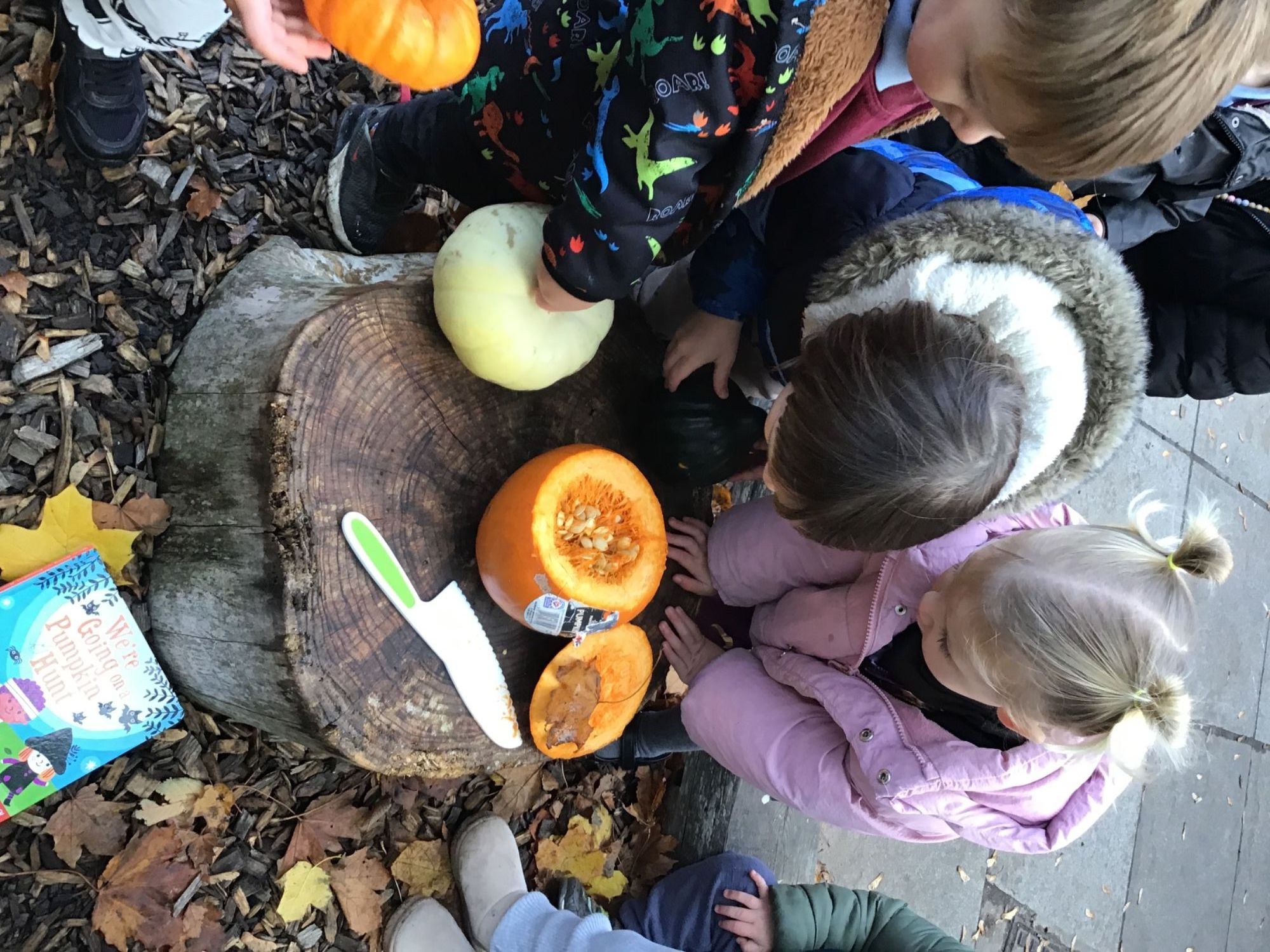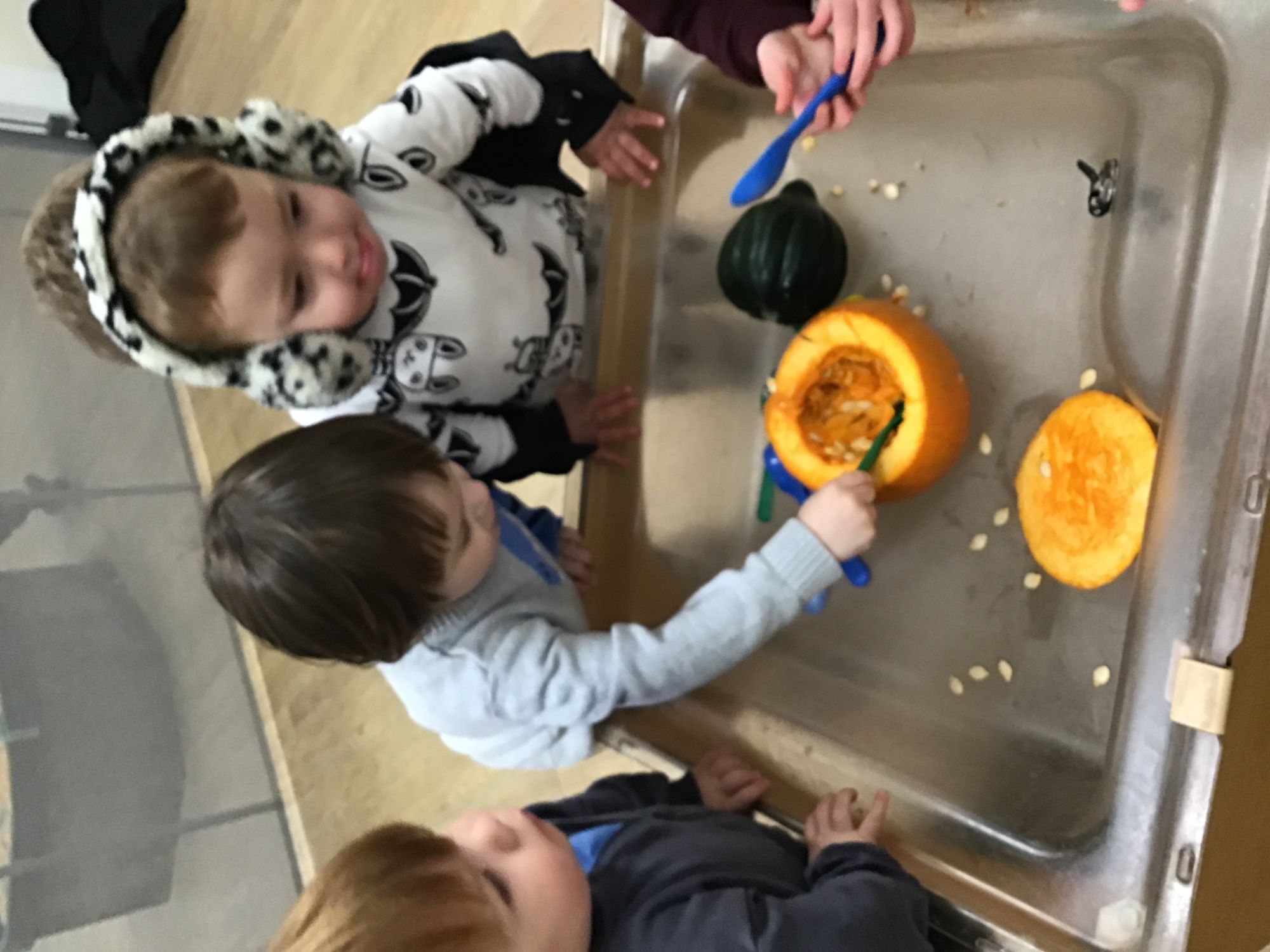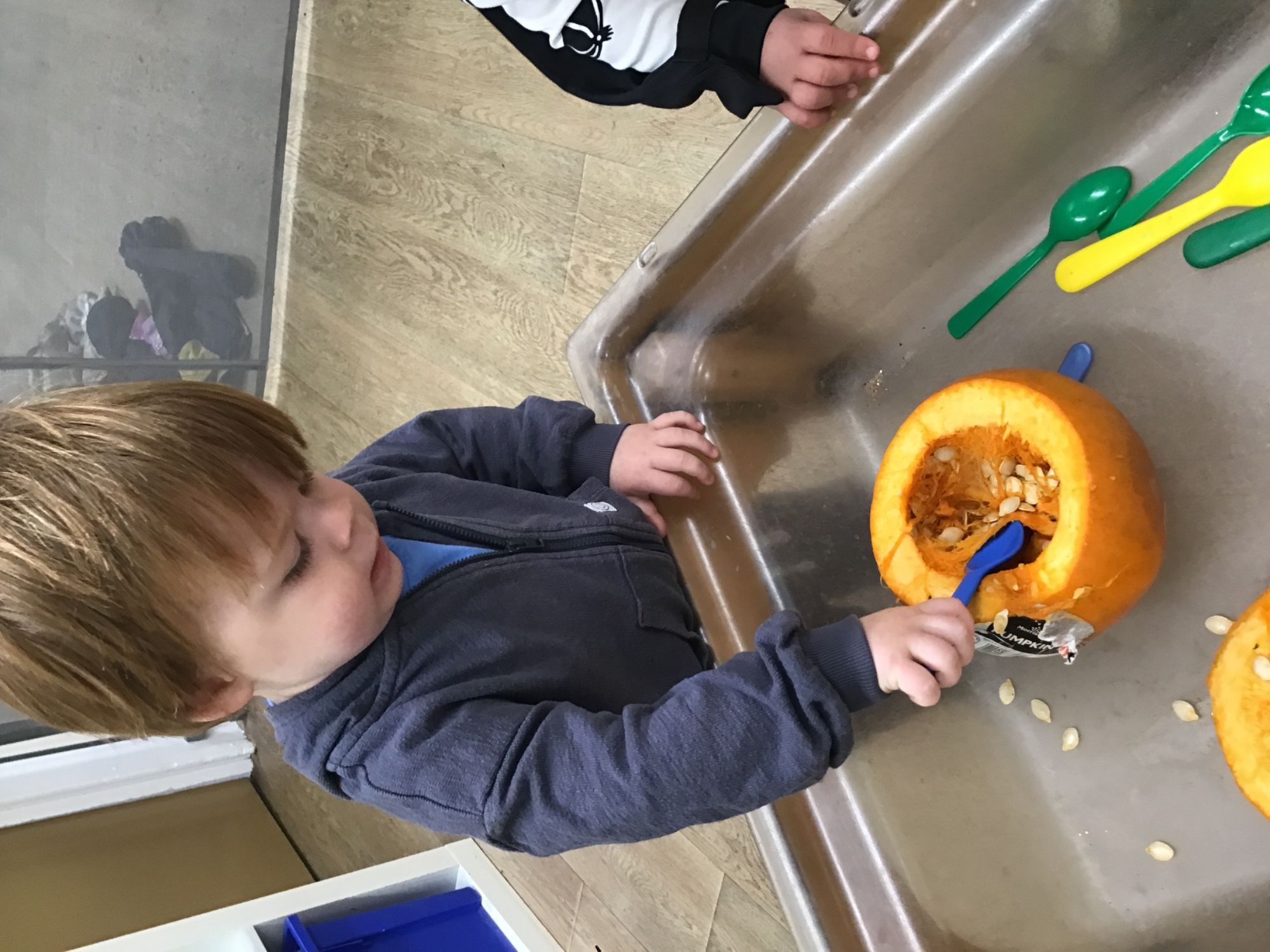 Mrs Borrowdale cut the top off the biggest orange pumpkin and we all looked inside! We thought it looked like orange spiderwebs! The inside of the pumpkin felt soft and gooey!