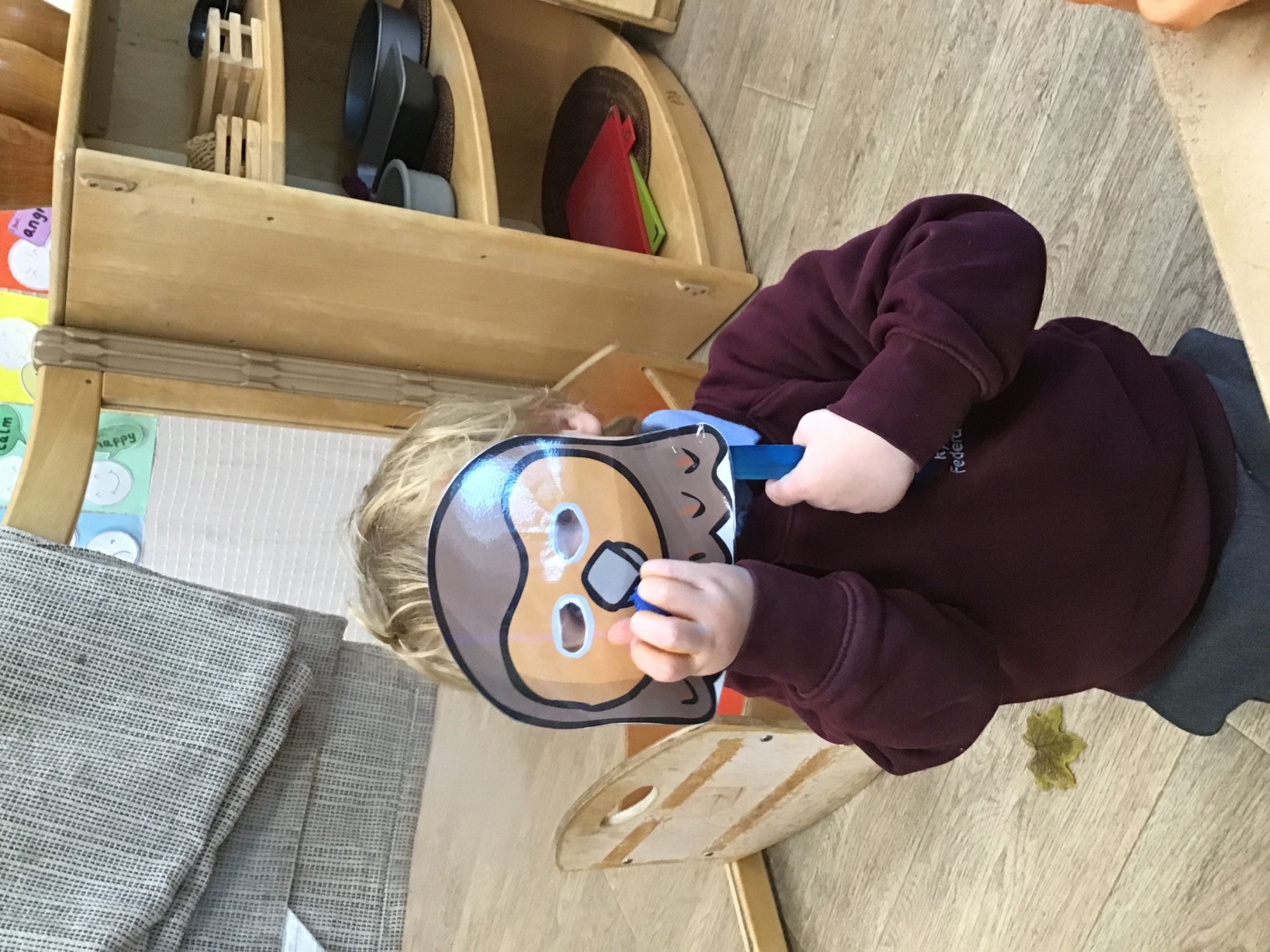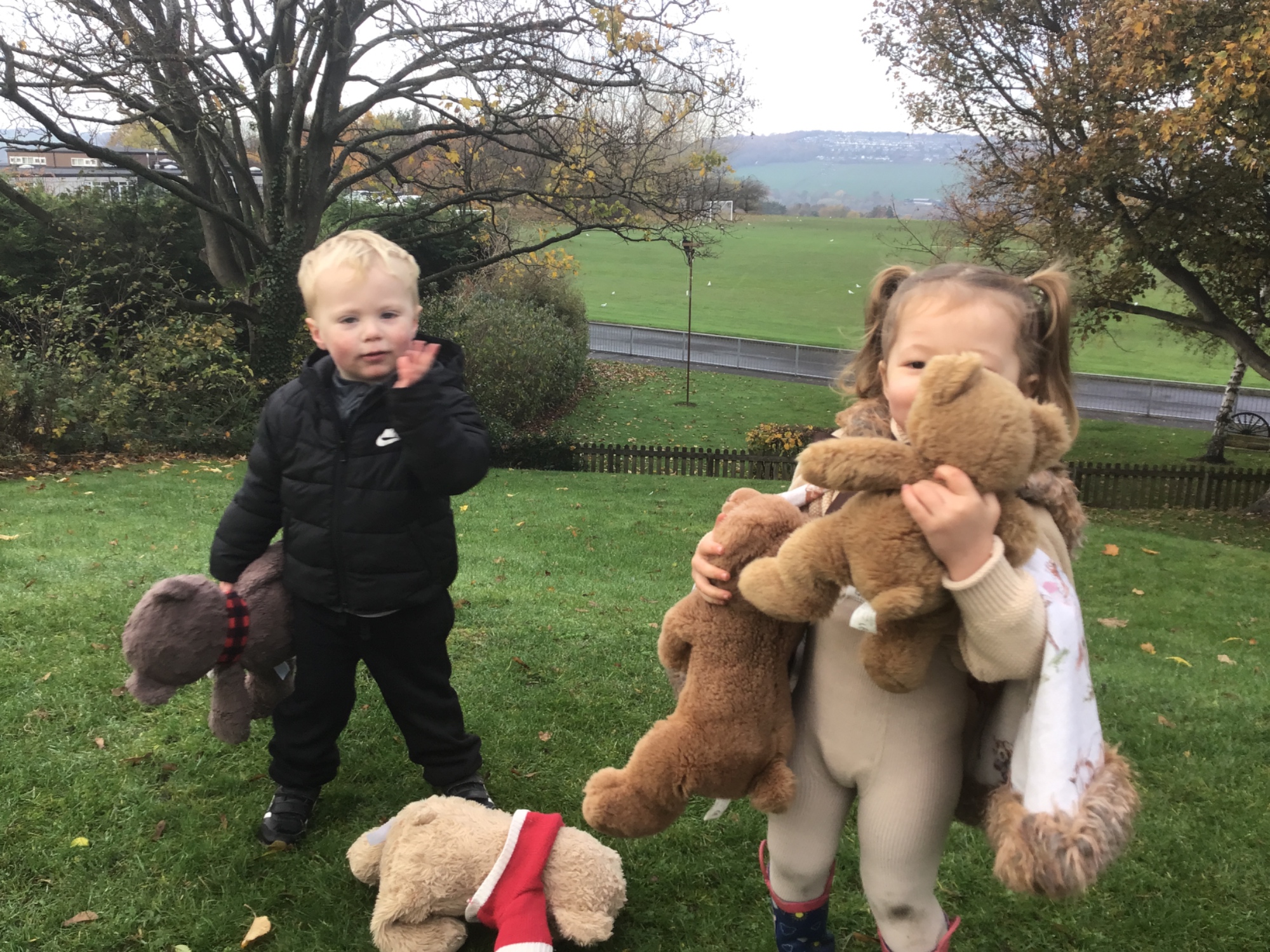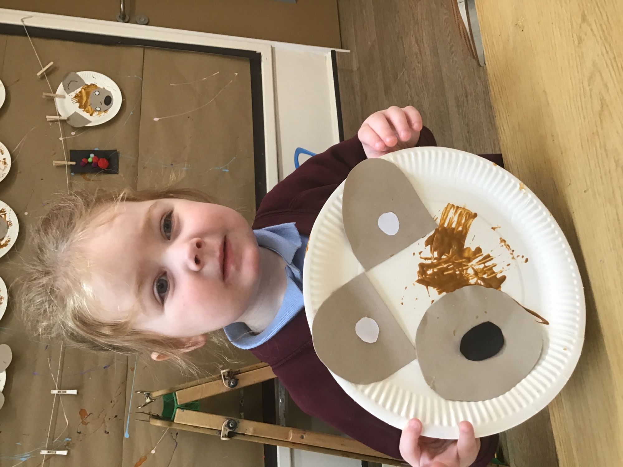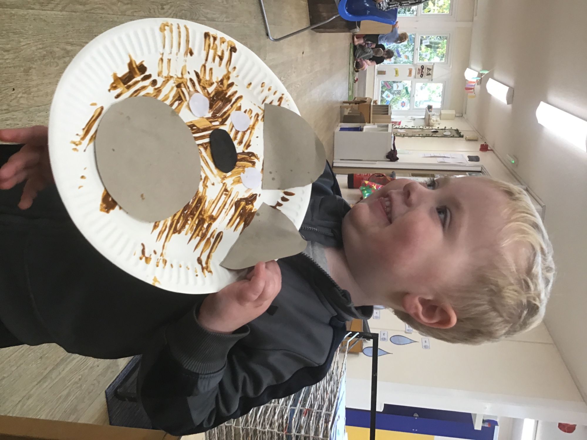 We have been on a Bear Hunt. We made Bear faces then we walked through swishy grass, squelchy mud, a cold river, a snowstorm, a dark forest and found lots of Bears on Nursery hill! What an adventure!