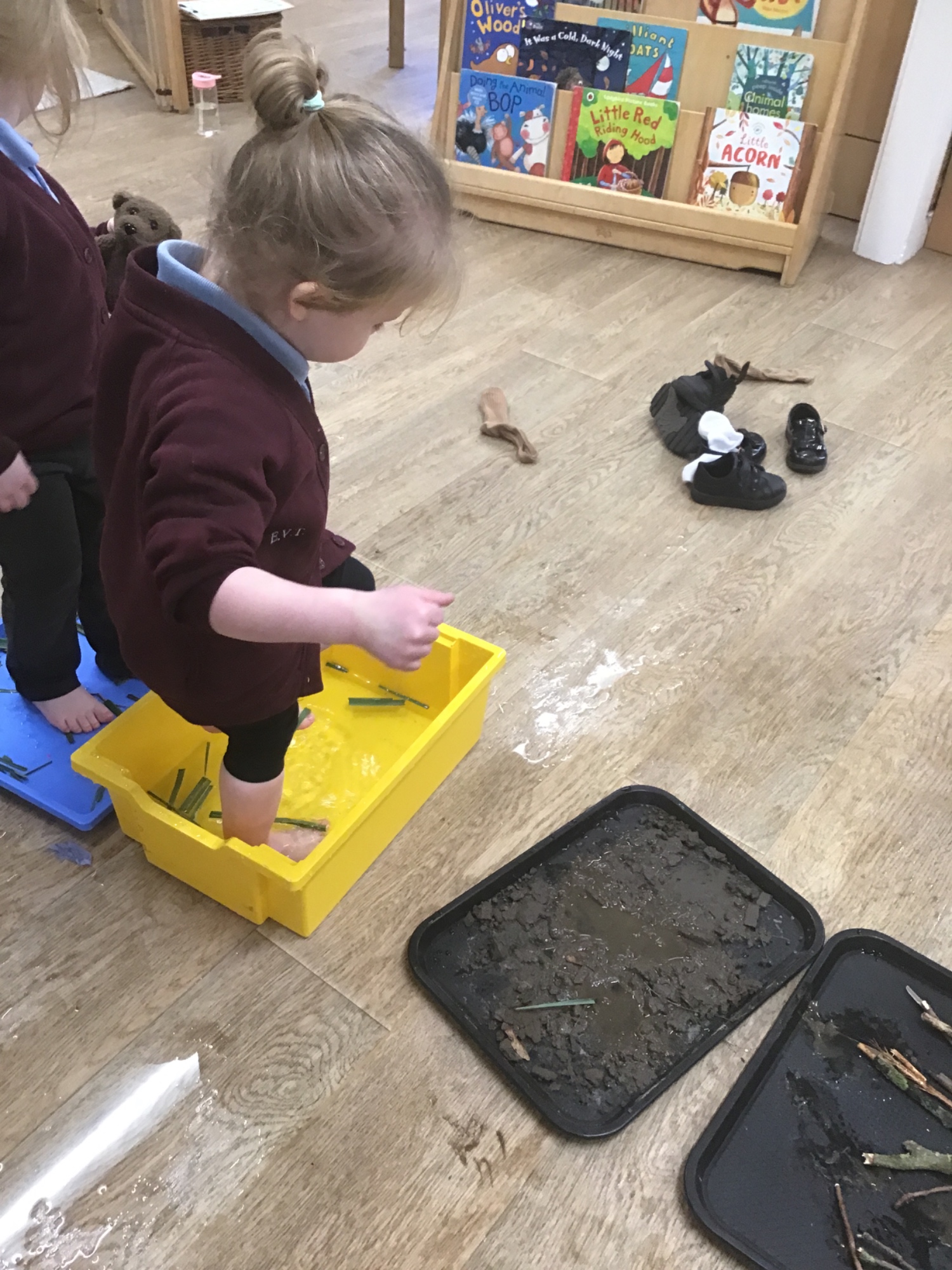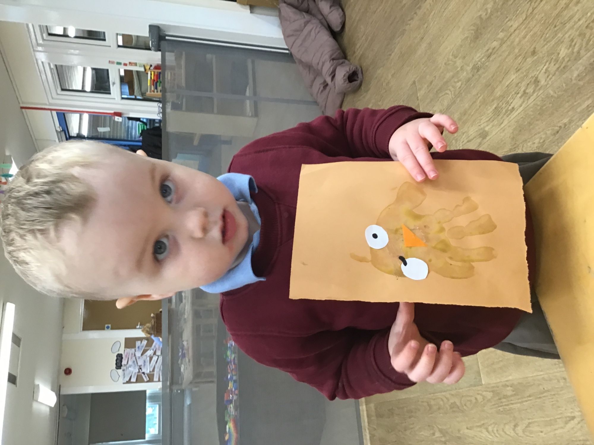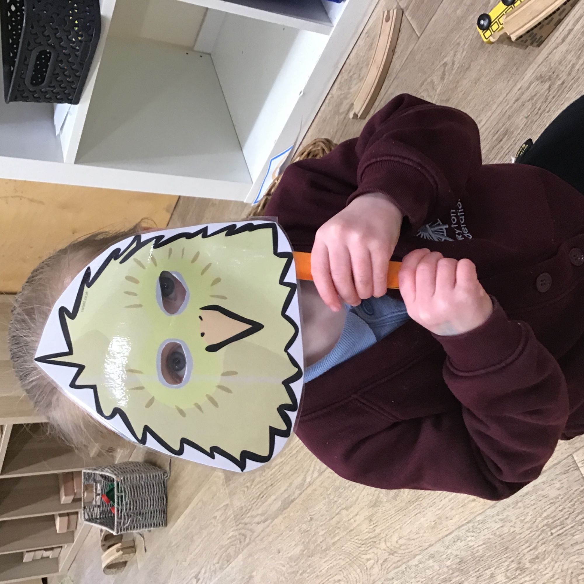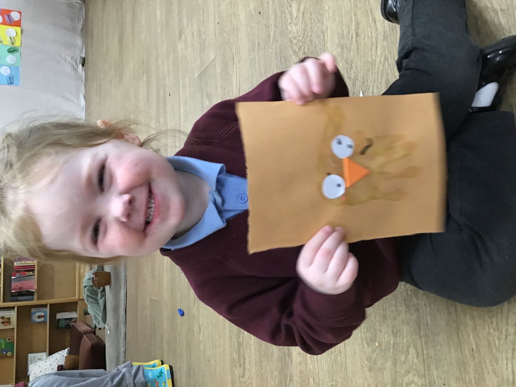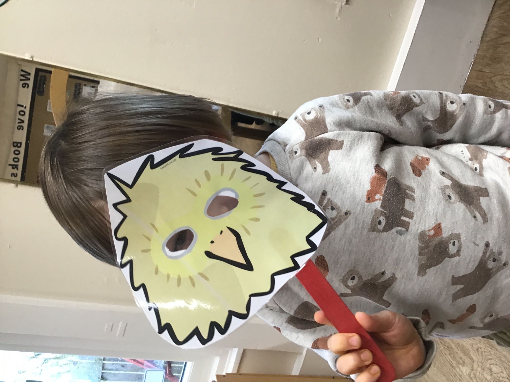 We have been on a Bear Hunt. We made Bear faces then we walked through swishy grass, squelchy mud, a cold river, a snowstorm, a dark forest and found lots of Bears on Nursery hill! What an adventure!