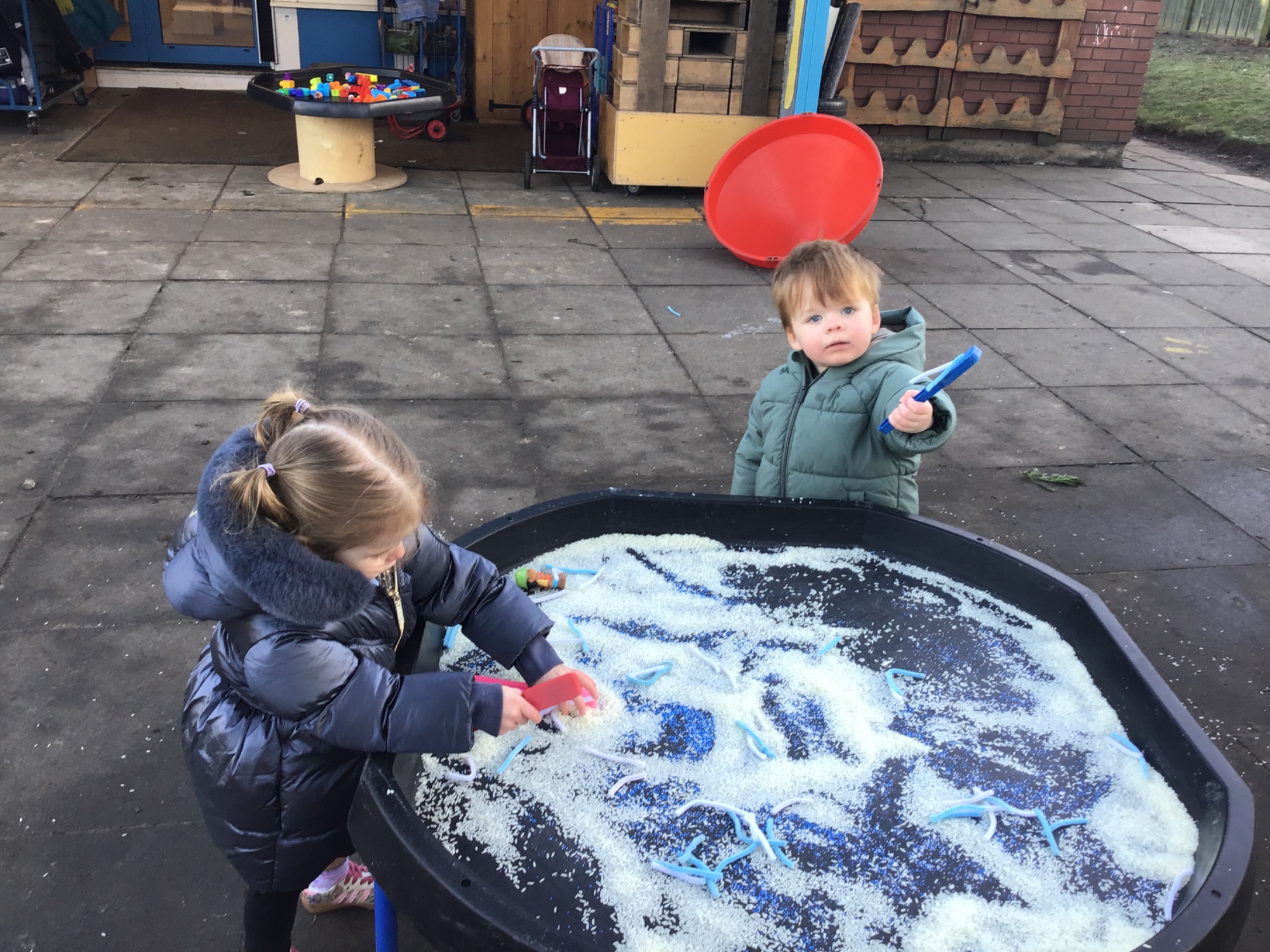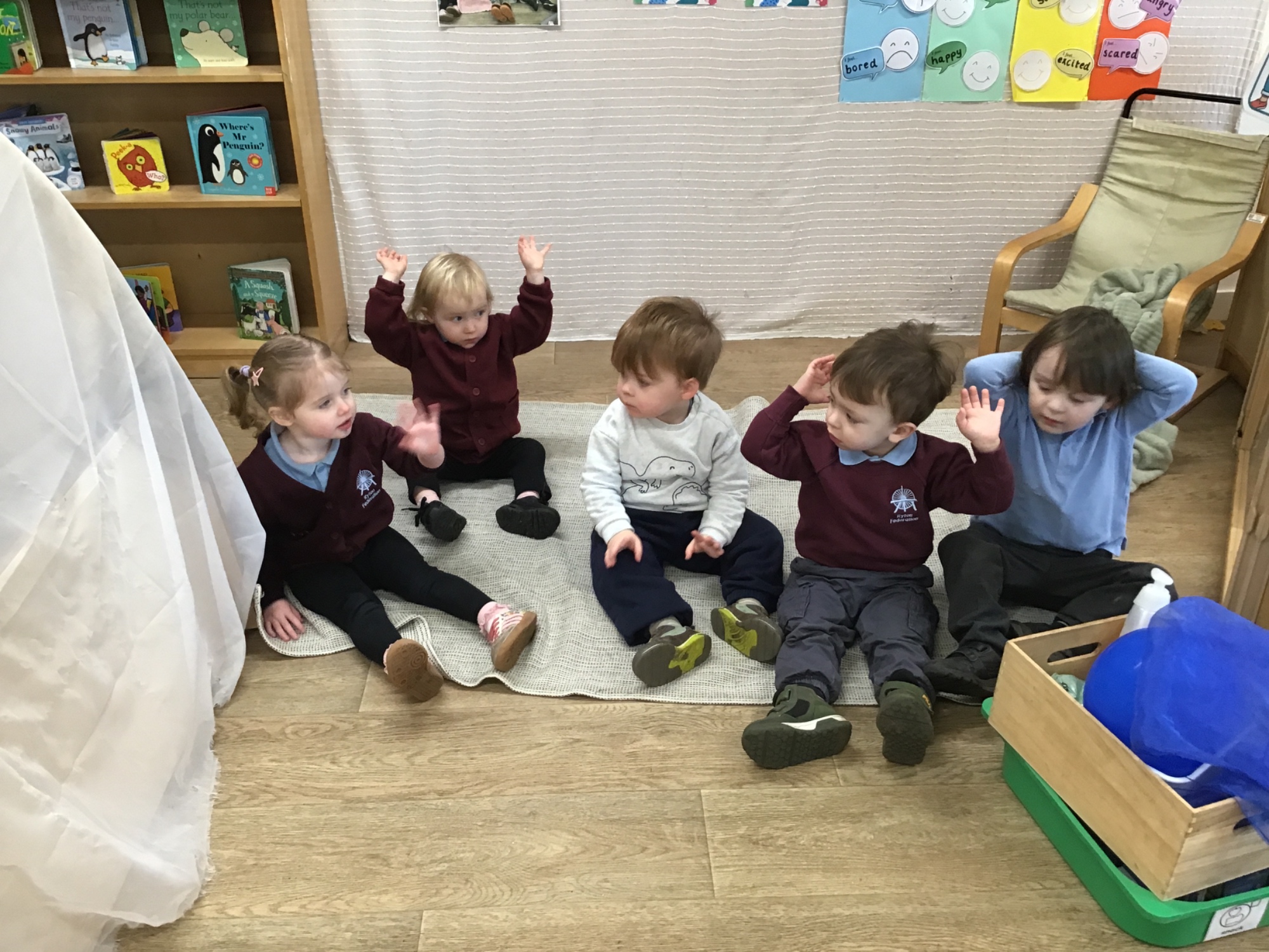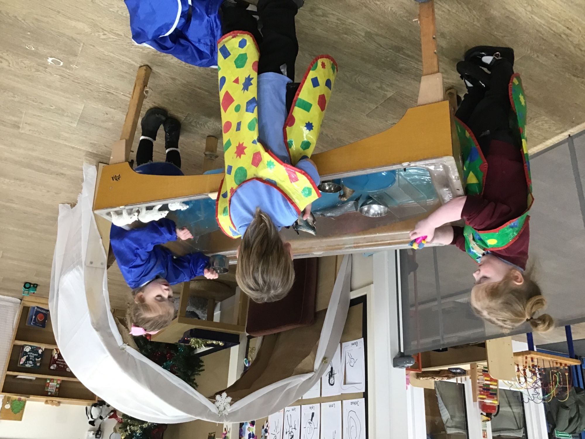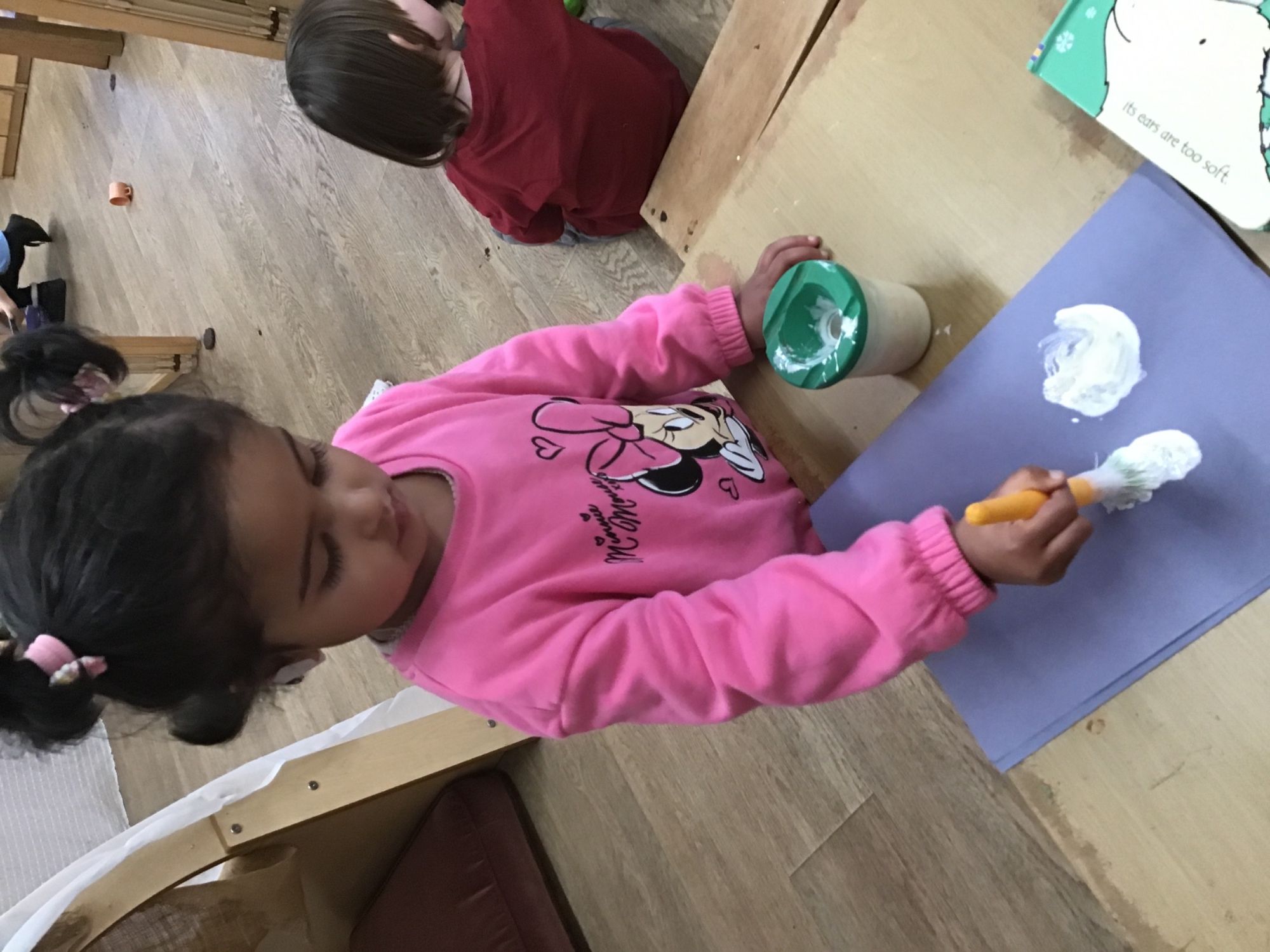 This week in Bumblebees we have been looking at books about Arctic animals. We have made pictures of polar bears, explored ice - melting with warm water in spray bottles, using tools to break the ice and painting the ice. We have enjoyed lots of mark making, dressing dolls, construction both small scale and with the large blocks outside.