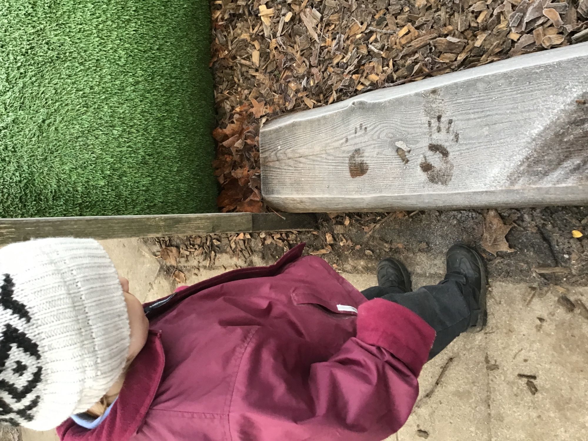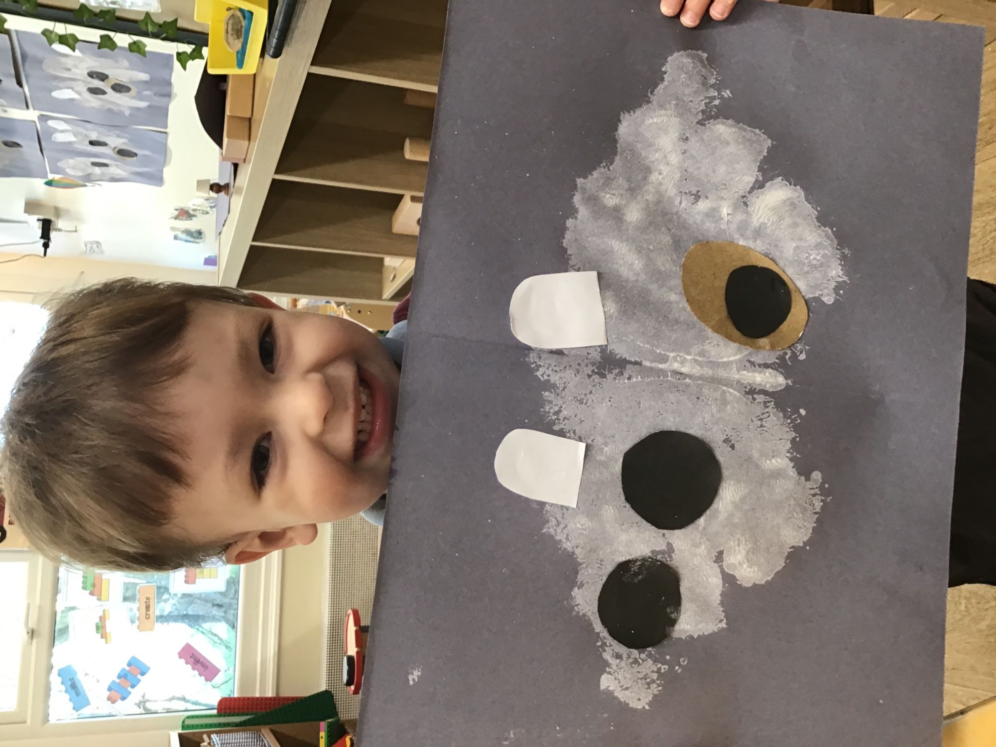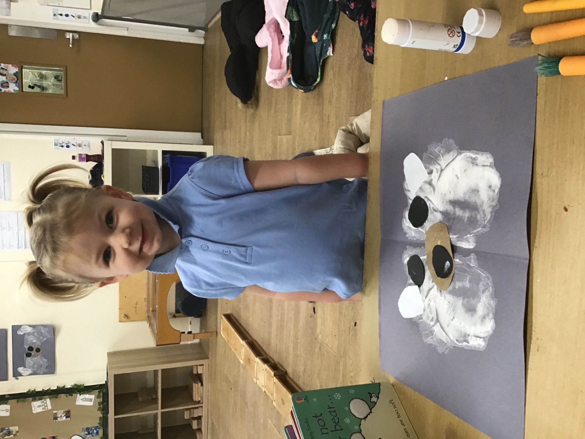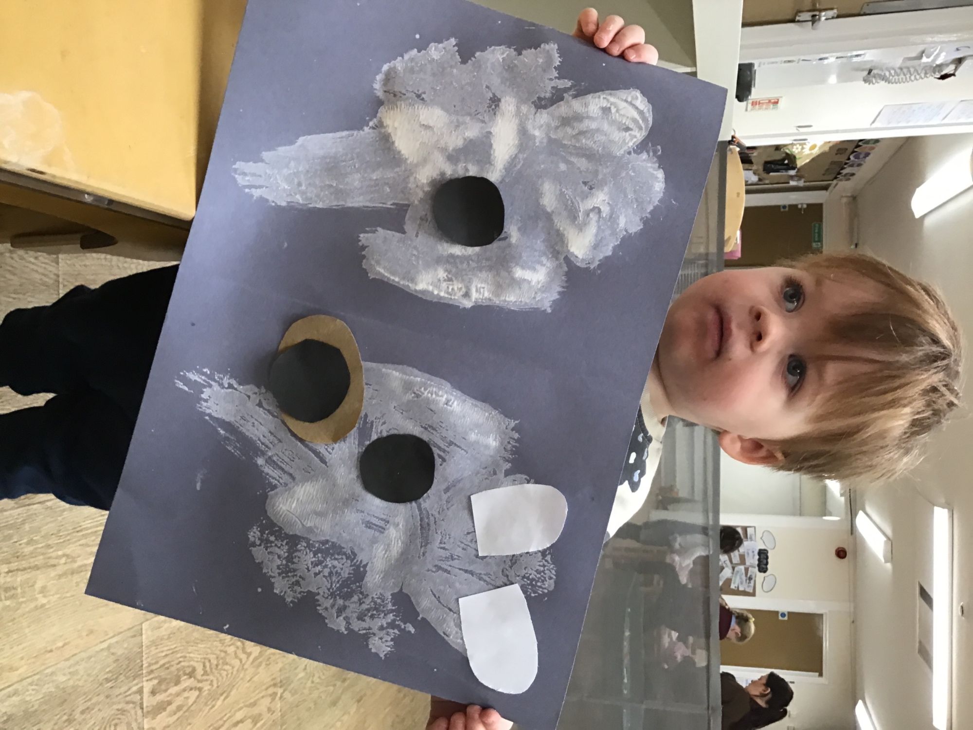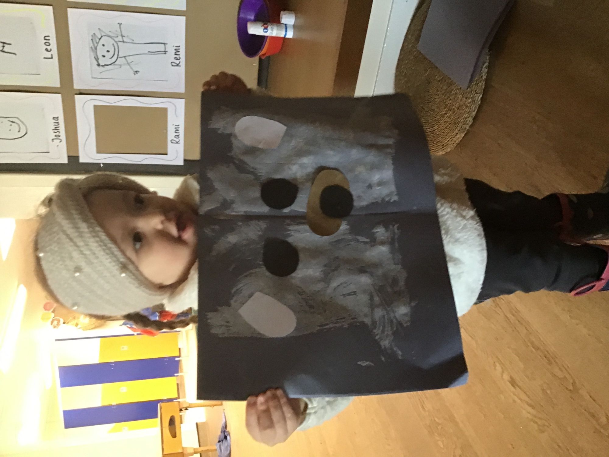We have been on a Bear Hunt. We made Bear faces then we walked through  swishy grass, squelchy mud, a cold river, a snowstorm, a dark forest and found lots of Bears on Nursery hill! What an adventure!