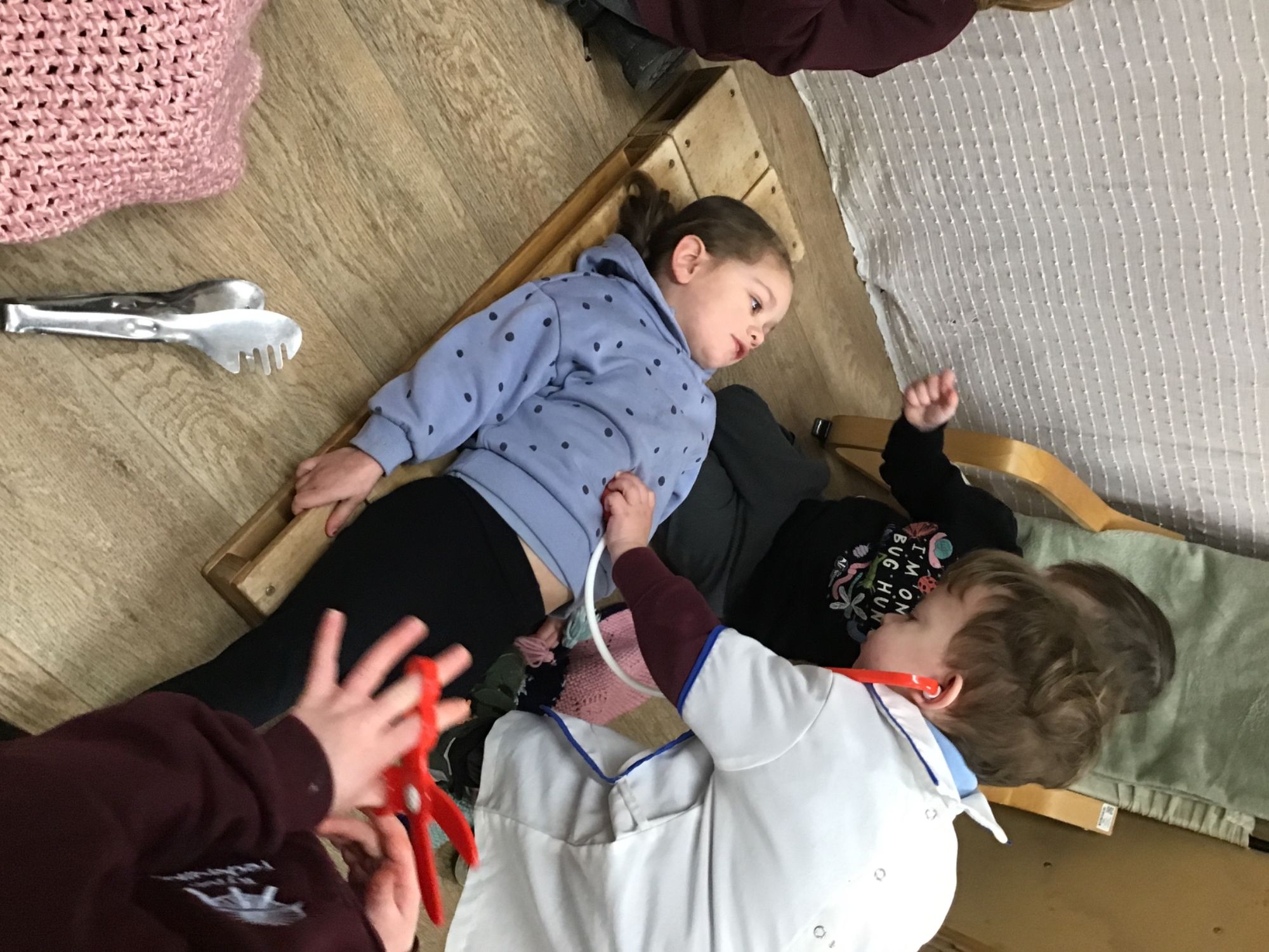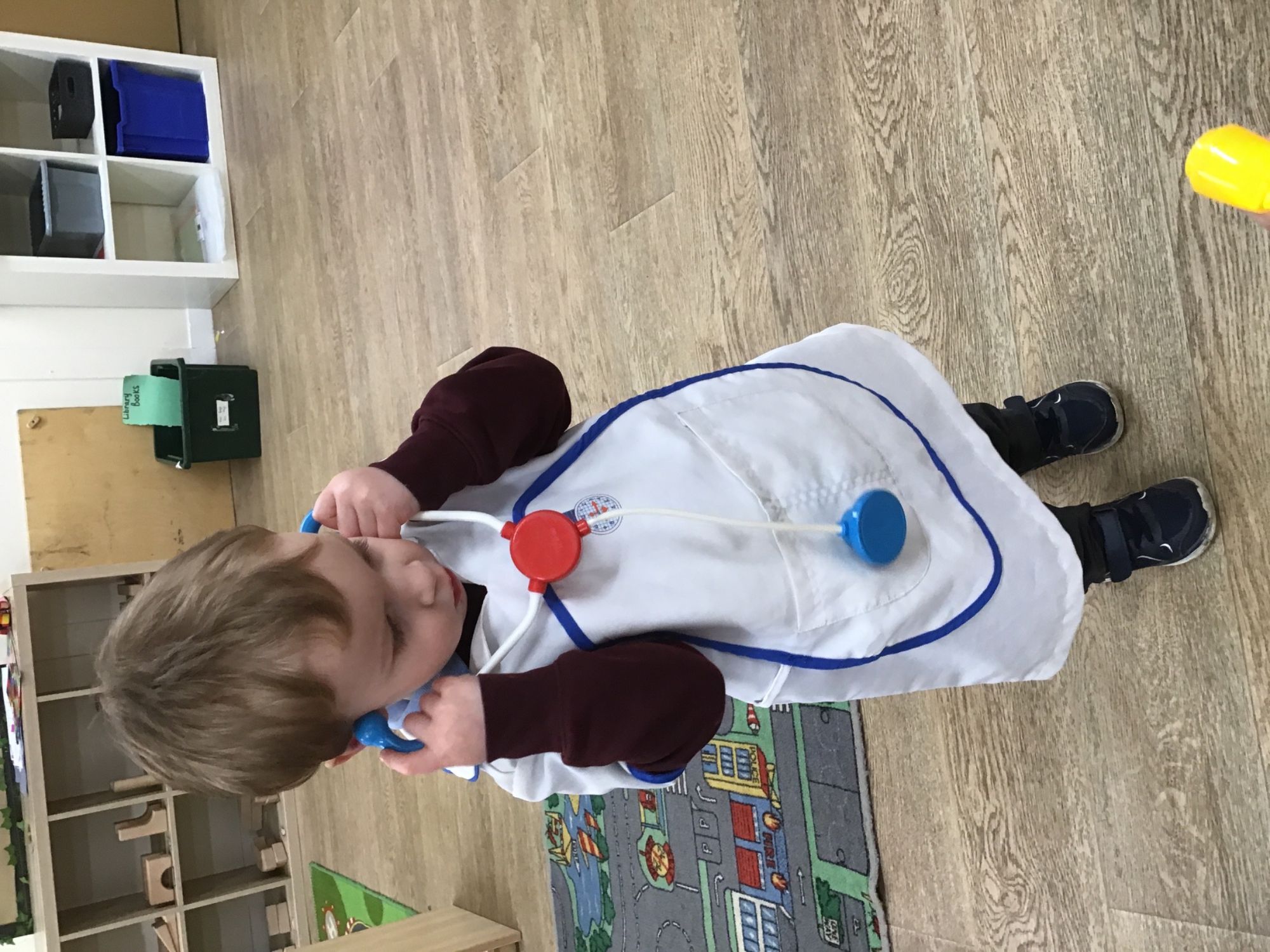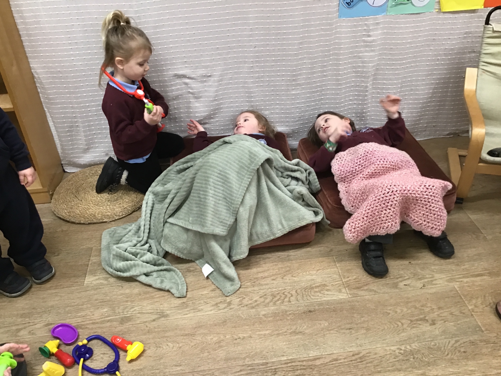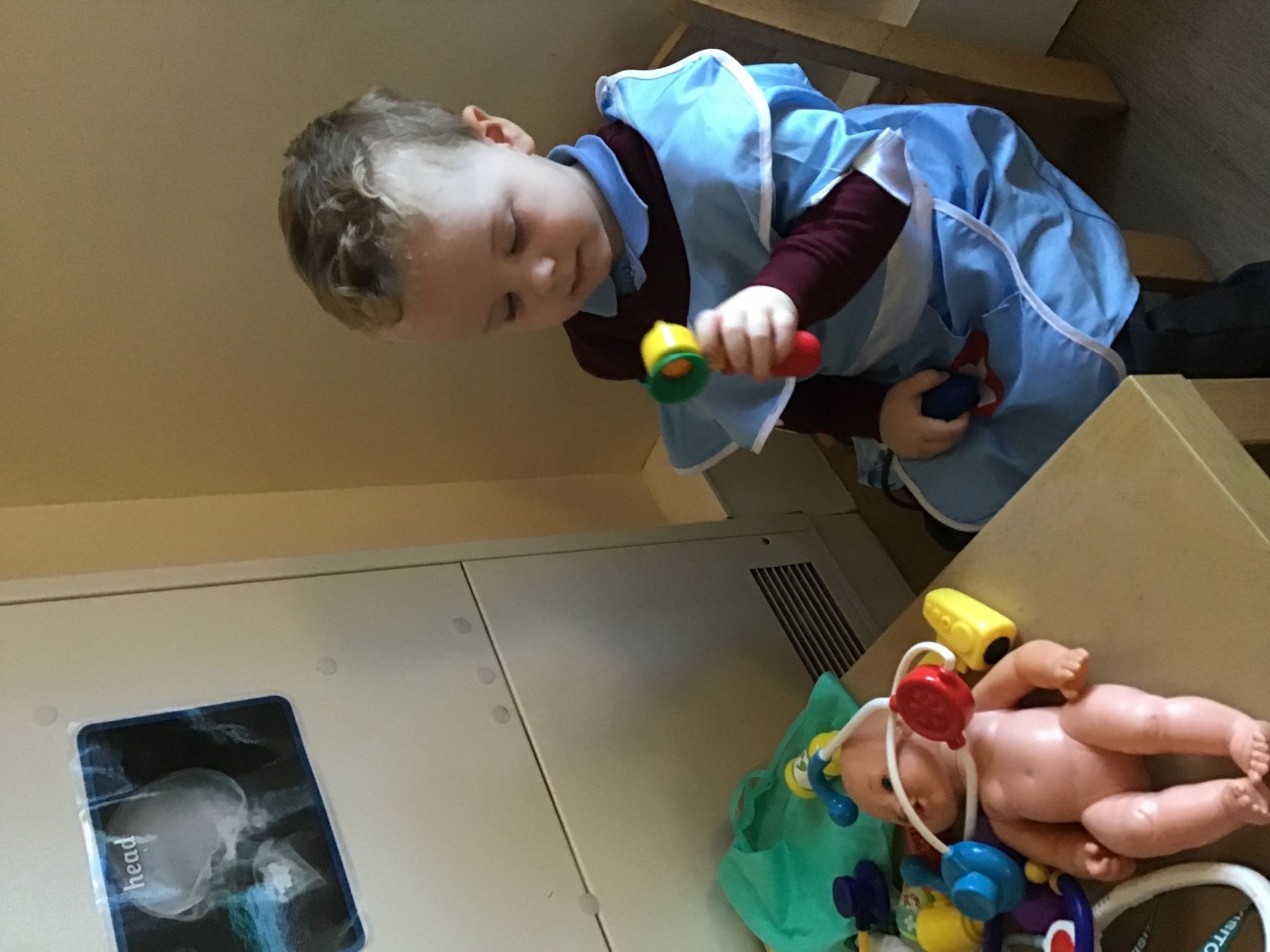 Butterfly Group have read stories about Fire engines and Fire this week, with lots of red, yellow and orange colours used in painting, play dough and tuff trays( rice/pasta). We have LOVED  playing in our role play hospital and pretending to be Doctors and nurses.