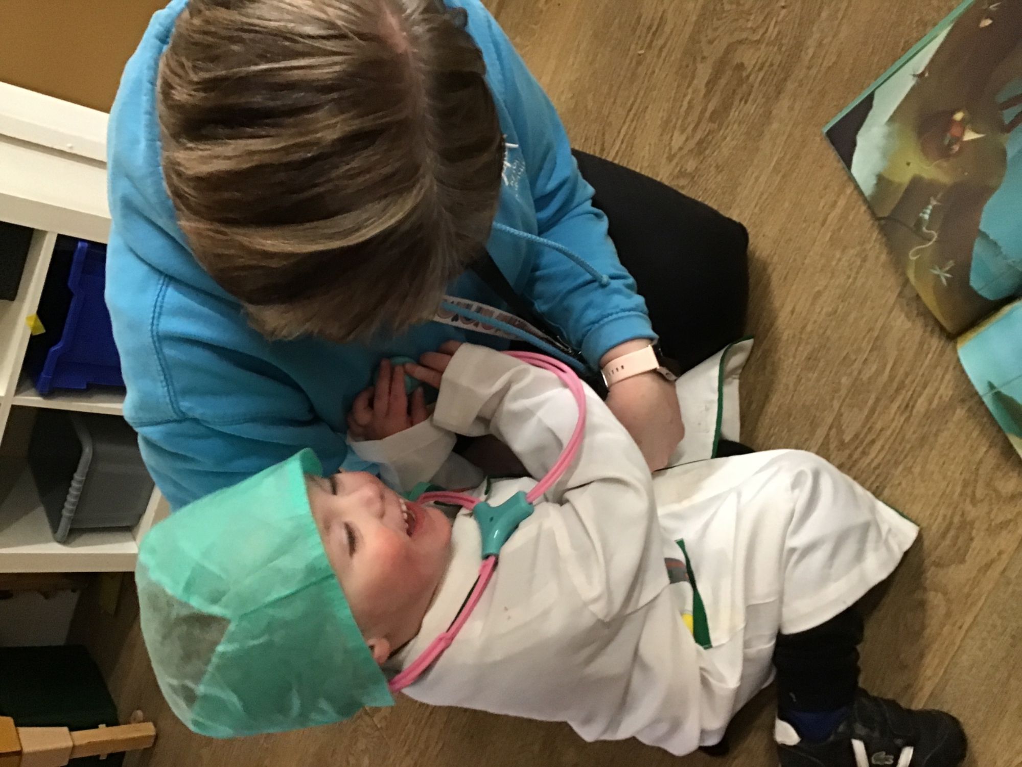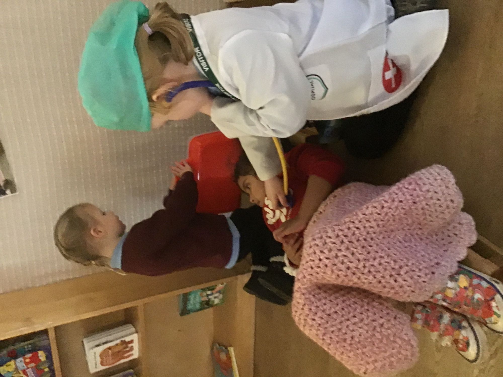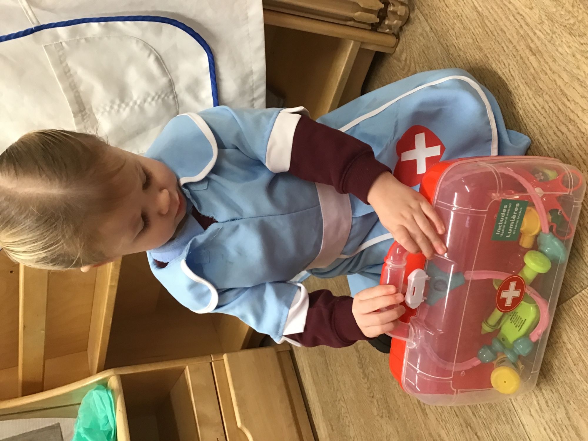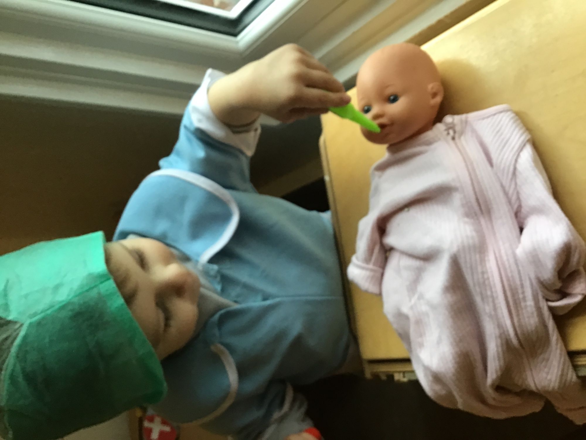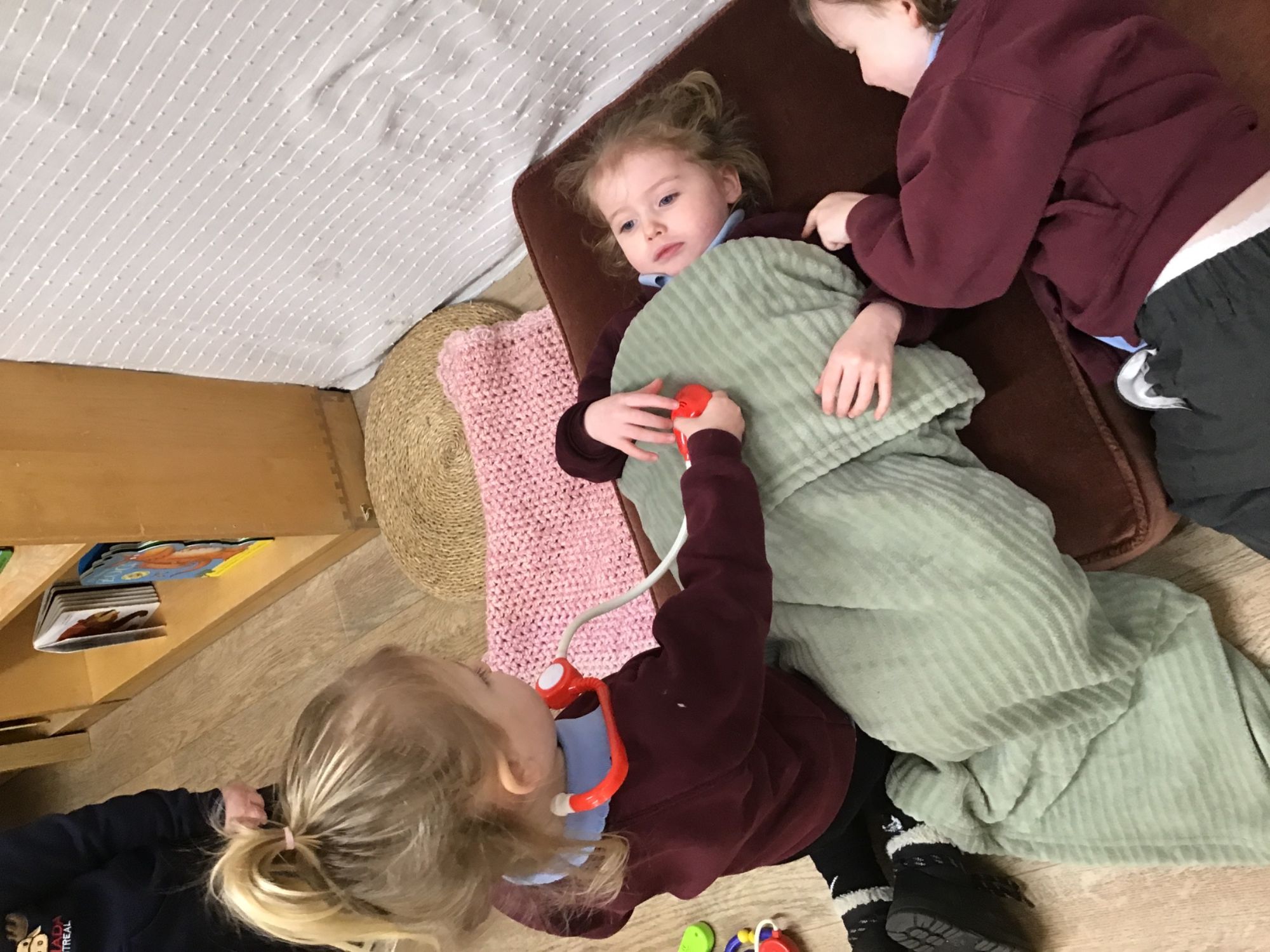 Butterfly Group have read stories about Fire engines and Fire this week, with lots of red, yellow and orange colours used in painting, play dough and tuff trays( rice/pasta). We have LOVED  playing in our role play hospital and pretending to be Doctors and nurses.