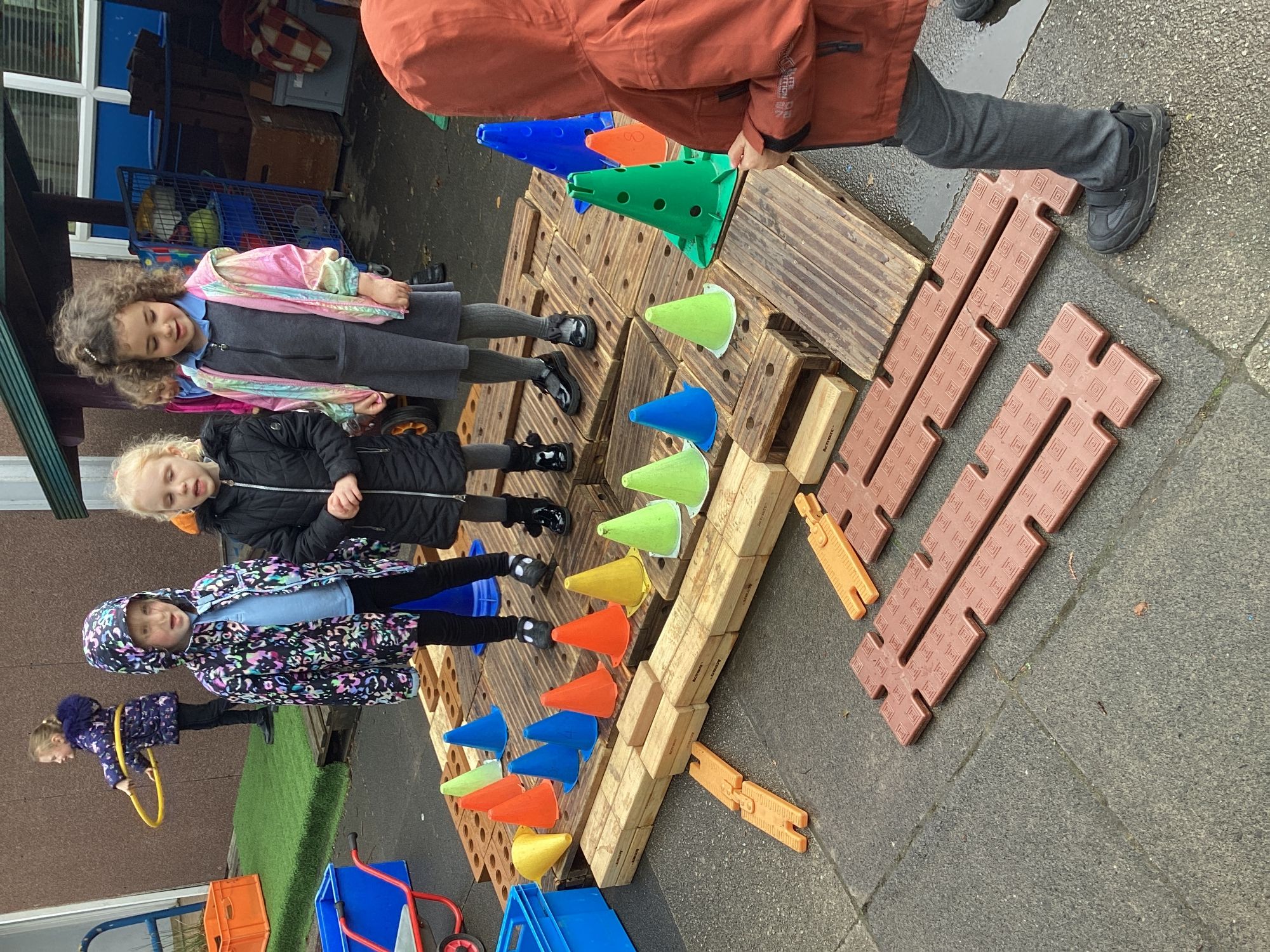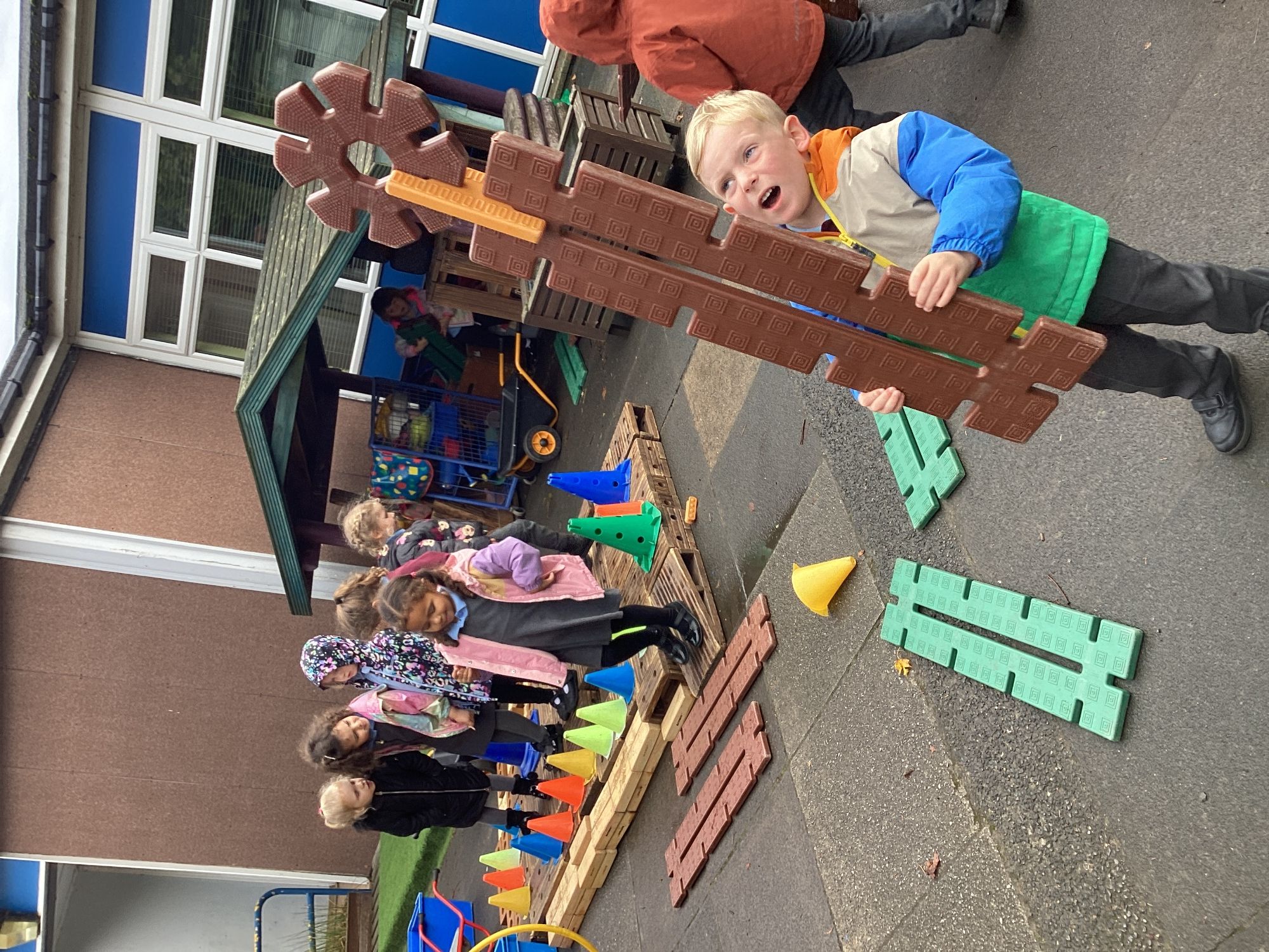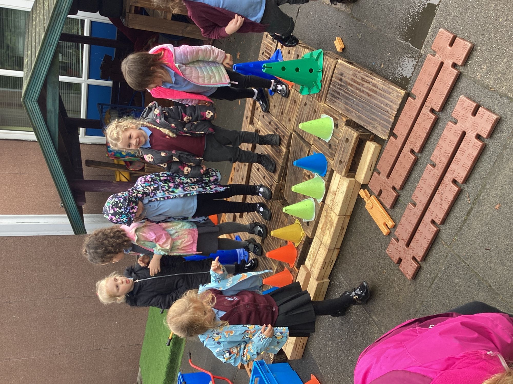 The children used the large construction resources to make their own stage to perform on with a 'cone light show' at the front and fireworks at the side. They sang their favourite songs and sounded amazing!!